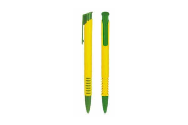 Caneta, corpo plástico amarelo, clipe e botão de acionamento na cor verde. Gravação por tampografia com 01 cor inclusa.