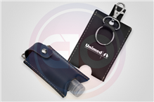 Kit executivo com 3 peças. Conteúdo: - Porta cartão de couro sintético com metal - Chaveiro de metal com couro sintético - Caneta de metal com couro sintético / Uma gravação já inclusa.
