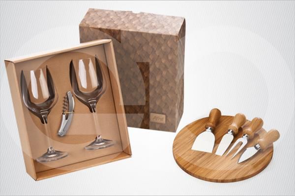 Caixa para presente com 02 taças de vidro para vinho 380ml, tábua para queijo em bambu, faca de ponta, espátula, garfo e faca ponta reta em bambu/aço inox, abridor saca-rolhas em inox » Embalagem: Caixa presente - Med.: 285x 245x 100mm » Gravação: A laser taças, espátula, abridor, tábua e plaqueta.